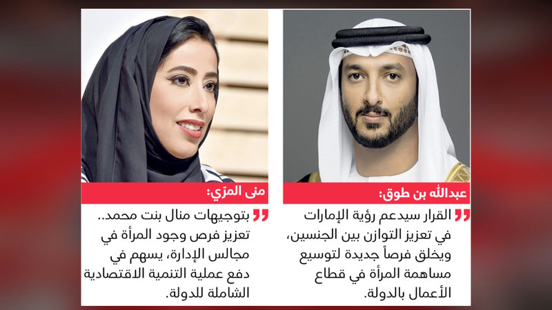وأكد وزير الاقتصاد، عبدالله بن طوق المري، أن دولة الإمارات بفضل توجيهات قيادتها الرشيدة حريصة على مواصلة الجهود، لتعزيز تمكين مساهمة المرأة في مختلف المجالات والأنشطة، وتعزيز دورها في مسيرة التنمية الاقتصادية المستدامة، وفي هذا الإطار سيدعم هذا القرار رؤية الدولة في تعزيز التوازن بين الجنسين، ويخلق فرصاً جديدة لتمكين المرأة في قطاع الأعمال، ويعزز من حضورها في مواقع صنع القرار والمراكز القيادية، بما يرسّخ المكانة الرائدة لدولة الإمارات في المؤشرات العالمية التنافسية المرتبطة بالتوازن بين الجنسين.