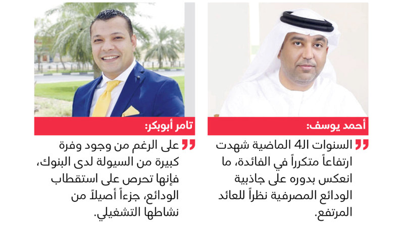 وذكرا لـ«الإمارات اليوم» أن نسبة العائد على الودائع المصرفية ارتفع بشكل متكرر منذ نحو أربعة أعوام حتى وصل إلى 5%، موضحين أن الودائع قصيرة الأجل لاتزال تحظى بنسبة عائد مرتفعة، فيما قد تتغير بشكل طفيف بالنسبة للودائع طويلة الأجل.