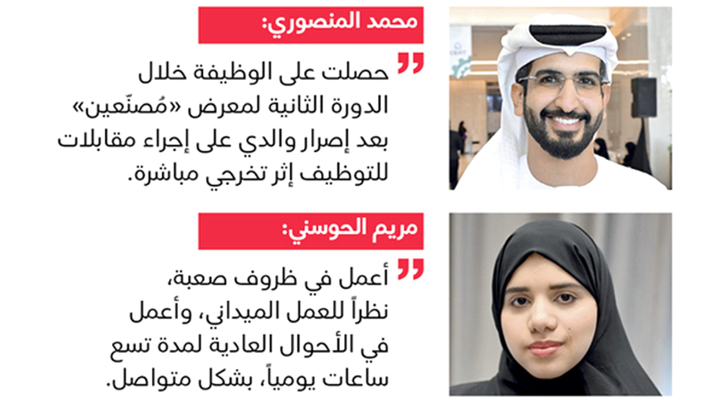 من جهته، قال المواطن عبدالله أحمد الخوري، إنه يعمل منسقاً لتقنية المعلومات في شركة «إم سي» للطاقة، منذ شهور عدة، بعد أن حصل على الوظيفة من خلال دورة سابقة لمعرض «مُصنّعين».
