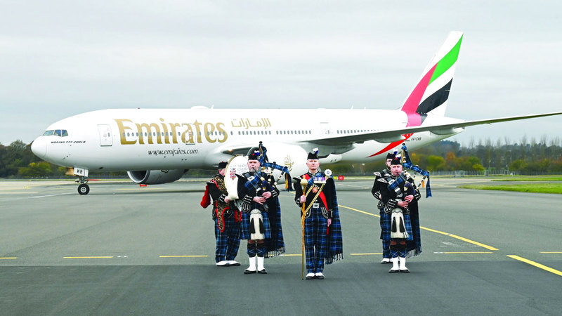 خلال الترحيب بطائرة «طيران الإمارات» لدى وصولها مطار إدنبرة. من المصدر