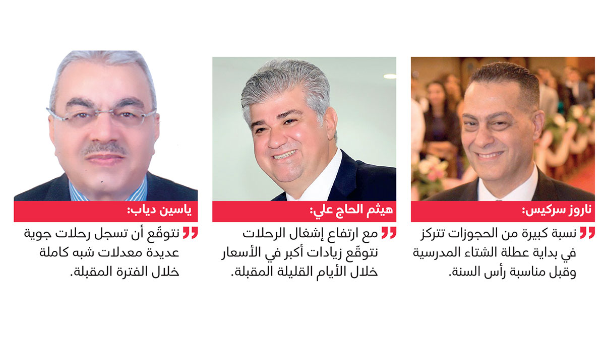 وذكر سركيس أن «الرحلات الجوية تشهد حالياً معدلات إشغال كبيرة، ومن المتوقع أن يسجل بعضها معدلات كاملة، خلال أيام قليلة»، لافتاً إلى أن «الطلب على السفر الجوي في ذروته خلال ديسمبر، ما أسهم في ارتفاع الأسعار بنسب متباينة تراوح بين 30 و40%»، موضحاً أن «نسبة كبيرة من الحجوزات تتركز في بداية عطلة الشتاء المدرسية وقبل مناسبة رأس السنة».
