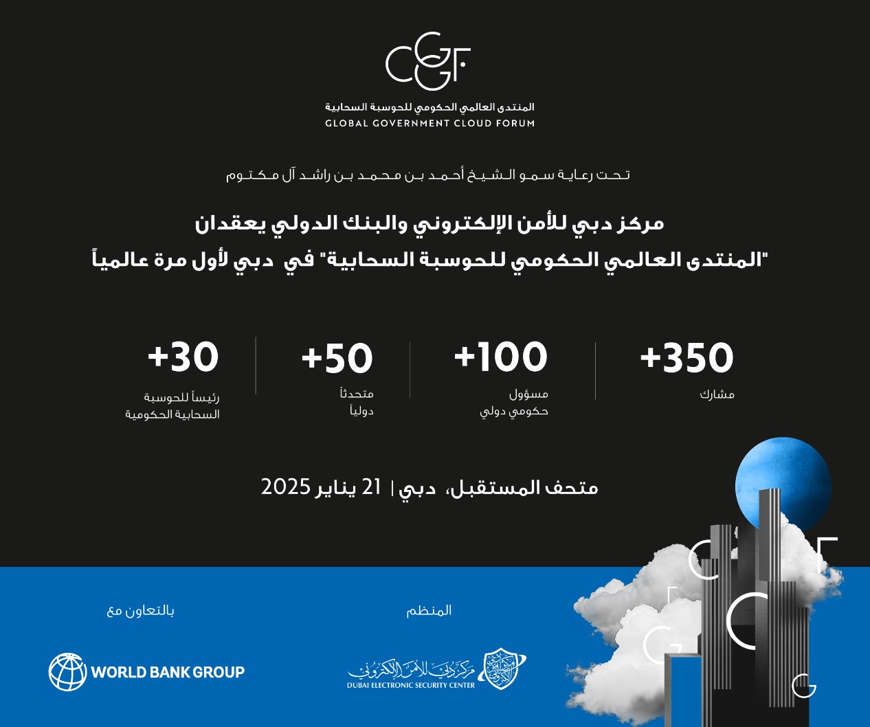 برعاية كريمة من سموّ الشيخ أحمد بن محمد بن راشد آل مكتوم، النائب الثاني لحاكم دبي، يستضيف مركز دبي للأمن الإلكتروني، بالتعاون مع مجموعة البنك الدولي، "المنتدى العالمي الحكومي للحوسبة السحابية" شهر يناير المُقبل بمشاركة أكثر من 350 خبيراً وما يزيد على 100 مسؤول حكومي دولي وأكثر من 50 متحدثاً دولياً و30 مبتكراً في مجال تقنيات الحوسبة السحابية في القطاع الحكومي، من أجل إعادة رسم ملامح قطاع الحوسبة السحابية، ومناقشة الإمكانات الكبيرة التي يوفرها لدفع عمليات الابتكار وتمكين الاقتصاد الرقمي.