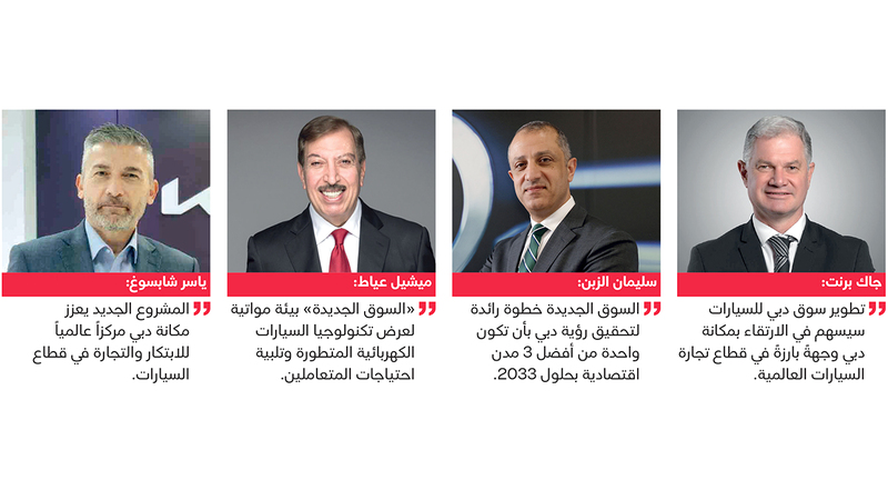 وأفاد الزبن بأن «مشروع تطوير سوق دبي للسيارات خطوة استراتيجية رائدة في رحلة دبي نحو تحقيق رؤيتها المستقبلية بأن تكون واحدة من أفضل ثلاث مدن اقتصادية بحلول 2033، وتعزيز مكانتها ضمن أكثر المدن نمواً في قطاع تجارة السيارات، إذ يمكن النظر إلى مضاعفة حجم السوق من 2.8 مليون قدم مربعة إلى 20 مليون قدم مربعة على أنها نقطة تحول ستنقل السوق إلى مستوى جديد من التميز».