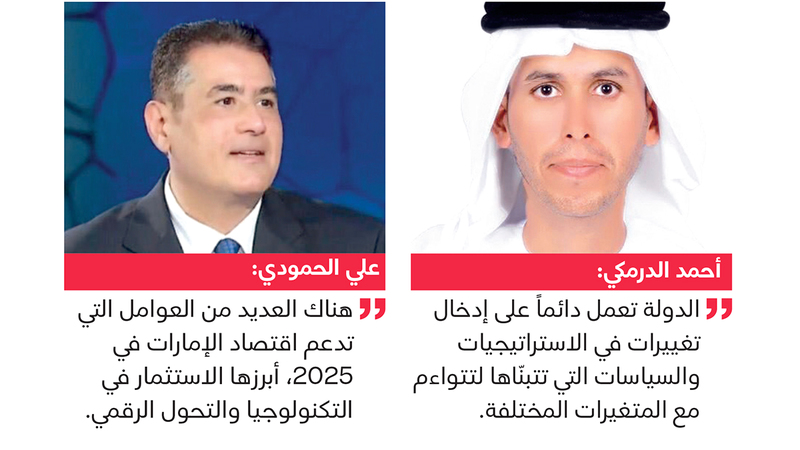 وأضاف الدرمكي أن دولة الإمارات تعمل دائماً على إدخال تغييرات في الاستراتيجيات والسياسات التي تتبنّاها لتتواءم مع المتغيرات المختلفة، بهدف إيجاد حلول مبتكرة ومواجهة أي تحديات طارئة، مشيراً إلى أن الإمارات نجحت في تنويع اقتصادها بشكل كبير خلال سنوات قليلة، وبناء قطاعات اقتصادية قوية وقادرة على مواجهة التحديات، وأوضح أن هناك قطاعات رئيسة عديدة تقود النمو خلال عام 2025، أبرزها قطاعات السياحة والطيران، والتجزئة والاستثمار والتجارة الخارجية، إلى جانب وجود قطاع للنفط والطاقة حديث وقوي يواكب أحدث الابتكارات العالمية.