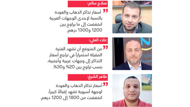 وأوضح سالم أن أسعار تذاكر الذهاب والعودة إلى إحدى الوجهات العربية الرئيسة، ارتفعت في بعض شركات الطيران، إلى ما يراوح بين 2300 و2400 درهم خلال رأس السنة، بينما انخفضت حالياً إلى ما يراوح بين 1200 و1300 درهم بنسبة تراجع تفوق 47%، لافتاً إلى أن الحجوزات المقبلة تشير إلى انخفاض الأسعار إلى 1050 درهماً تقريباً خلال الأيام المقبلة.
