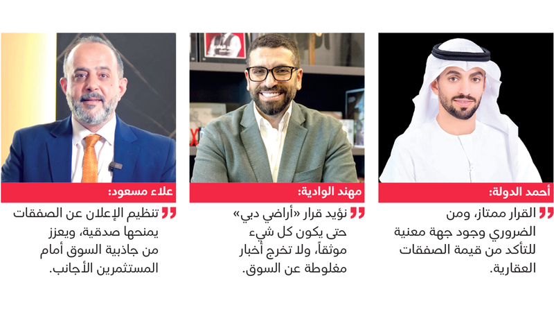 وصف عقاريون التعميم الأخير لدائرة الأراضي والأملاك في دبي - الخاص بضرورة التزام الشركات العقارية عدم إعلان أي صفقة عقارية عبر وسائل الإعلام قبل تسجيلها بشكل رسمي في نظام الدائرة، واعتبار أي إعلان يتم نشره قبل استكمال عملية التسجيل مخالفة للقوانين والأنظمة - بأنه قرار صائب ويصبّ في مصلحة شفافية السوق العقارية ويحميها، كما يحمي أصحاب العلاقة التعاقدية، ويؤكد أن هناك رقابة وتنظيماً من قبل دائرة الأراضي والأملاك على الصفقات العقارية.