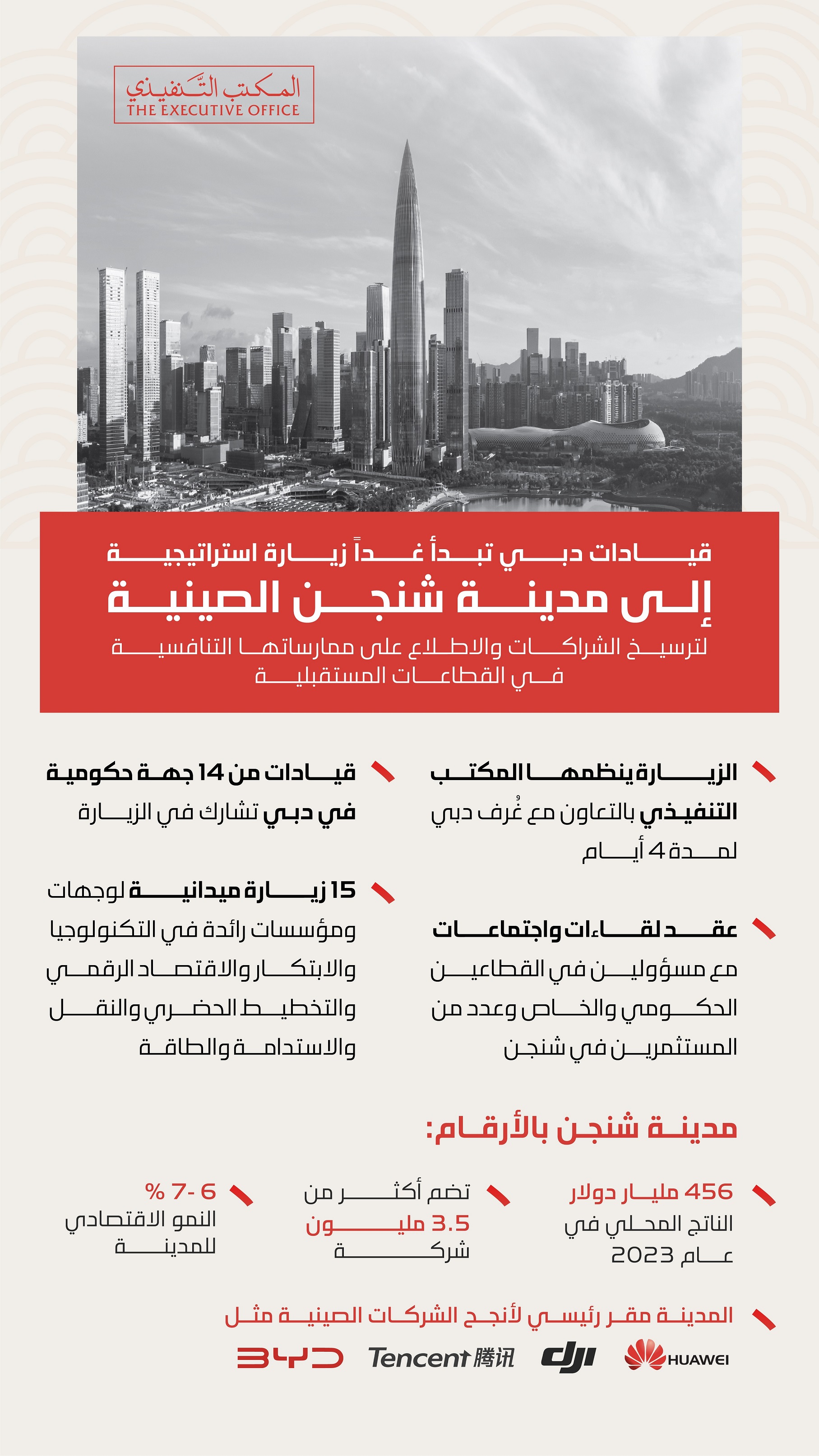 ينظم المكتب التنفيذي بالتعاون مع غرف دبي، زيارة إستراتيجية لقيادات دبي من 14 جهة حكومية إلى مدينة شنجن الصينية، تبدأ غداً ولمدة 4 أيام.