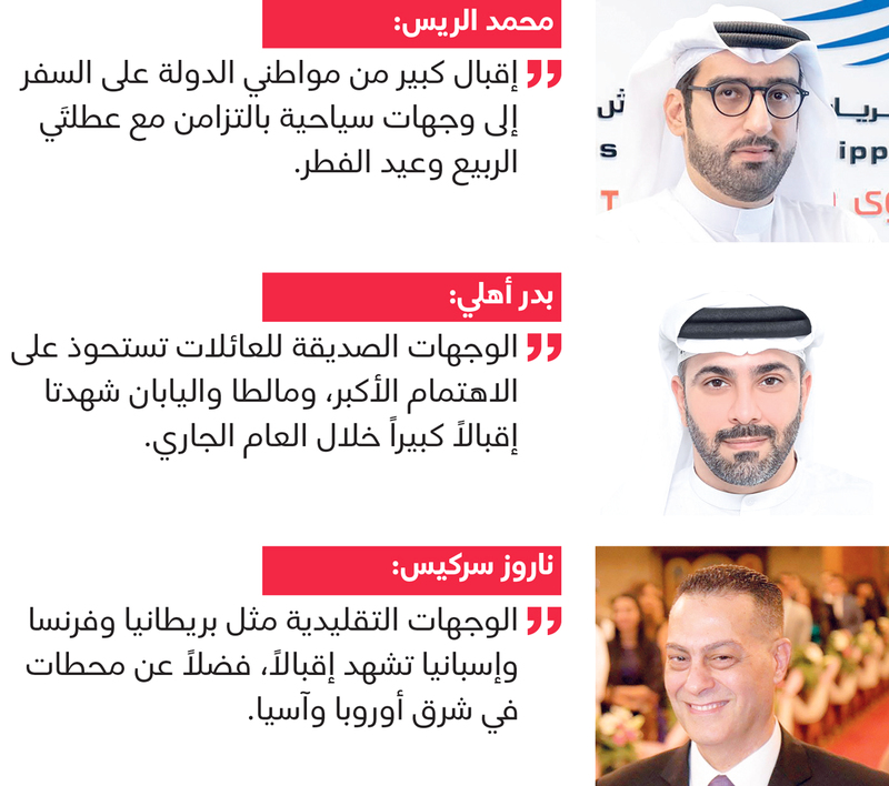 في السياق نفسه، قال المدير العام لـ«شركة بالحصا للسياحة»، ناروز سركيس، إن العديد من العائلات الإماراتية تستغل فرصة عطلتَي الربيع المدرسية وعيد الفطر لقضاء عطلات في الخارج، متوقعاً أن يرتفع معدل حجوزات المواطنين خلال الأيام القليلة المقبلة.