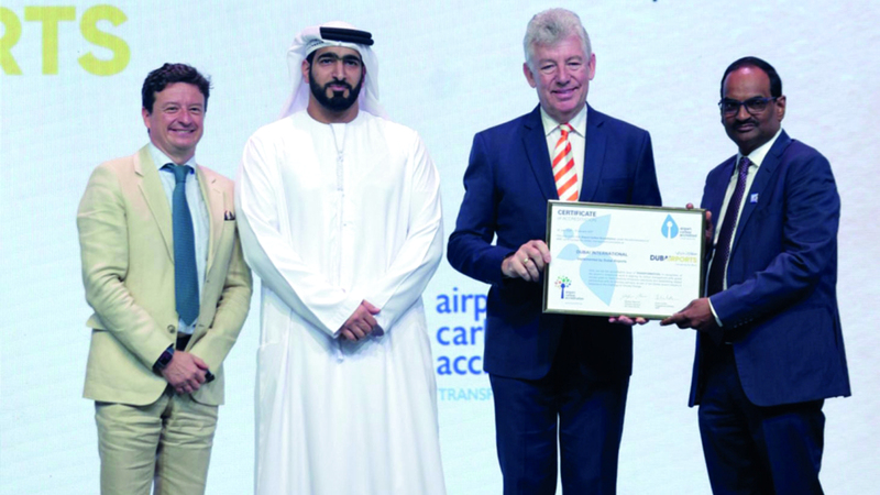 تسلّم الرئيس التنفيذي لمؤسسة مطارات دبي، بول غريفيث، شهادة الاعتماد الكربوني للمطارات من المستوى الرابع «التحول»، وذلك من مجلس المطارات الدولي، خلال اجتماع الجمعية الإقليمية للمجلس الدولي للمطارات في آسيا والمحيط الهادئ والشرق الأوسط.