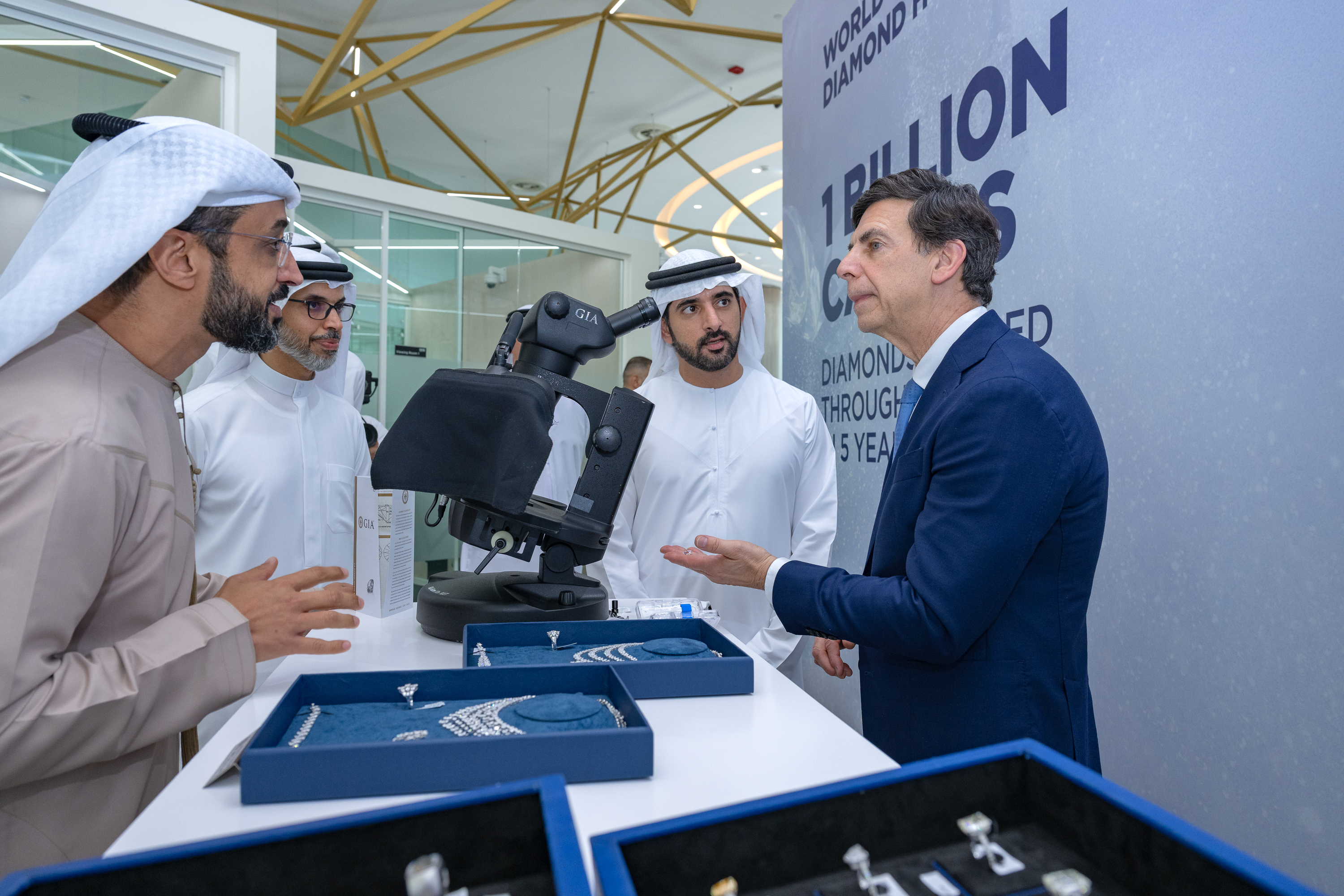 وقام سموّه بجولة ميدانية، يرافقه عمر سلطان العلماء، وزير دولة للذكاء الاصطناعي والاقتصاد الرقمي وتطبيقات العمل عن بُعد، في مرافق بورصة دبي للماس، اطّلع خلالها على مجموعة منتقاة من الماس الخام والمصقول، والأحجار الكريمة الملونة، بالإضافة إلى الماس المُنتج مخبرياً. كما استمع سموّه إلى شرح مفصّل حول المنظومة المتكاملة التي يديرها المركز لتجارة الماس، بما في ذلك التوسّع الاستراتيجي للمعهد الأمريكي للأحجار الكريمة ضمن منطقة أبتاون دبي التابعة للمركز.
