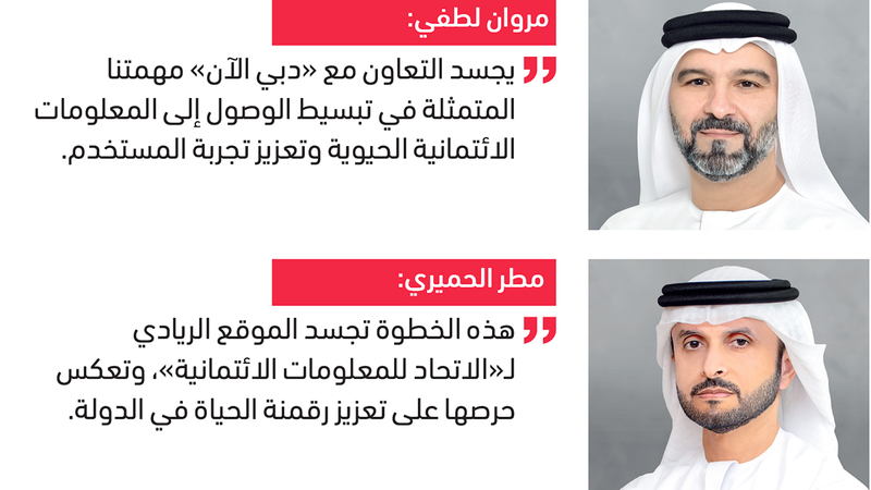 وقال المدير العام لـ«لاتحاد للمعلومات الائتمانية»، مروان أحمد لطفي: «ملتزمون بدعم أجندة التحول الرقمي في دولة الإمارات من خلال تعزيز التكامل عبر منصات الحكومة المحلية، يجسد هذا التعاون مع (دبي الآن) مهمتنا المتمثلة في تبسيط الوصول إلى المعلومات الائتمانية الحيوية، وتعزيز تجربة المستخدم».