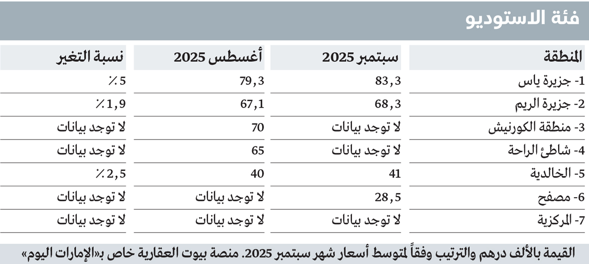 وفي فئة الاستوديو، أظهرت البيانات أن متوسط كلفة الإيجارات سنوياً لاستوديو في منطقة جزيرة ياس بلغ 83.3 ألف درهم خلال سبتمبر الماضي، مقارنة بـ79.3 ألف درهم خلال شهر أغسطس الماضي بارتفاع قدره 5%، في حين ارتفع متوسط الإيجار السنوي في منطقة الخالدية بنسبة 2.5% إلى 41 ألف درهم سنوياً، ونما في منطقة «جزيرة الريم» بنسبة 1.9% إلى 68.3 ألف درهم سنوياً، مقارنة بـ67.1 ألف درهم في أغسطس الماضي.