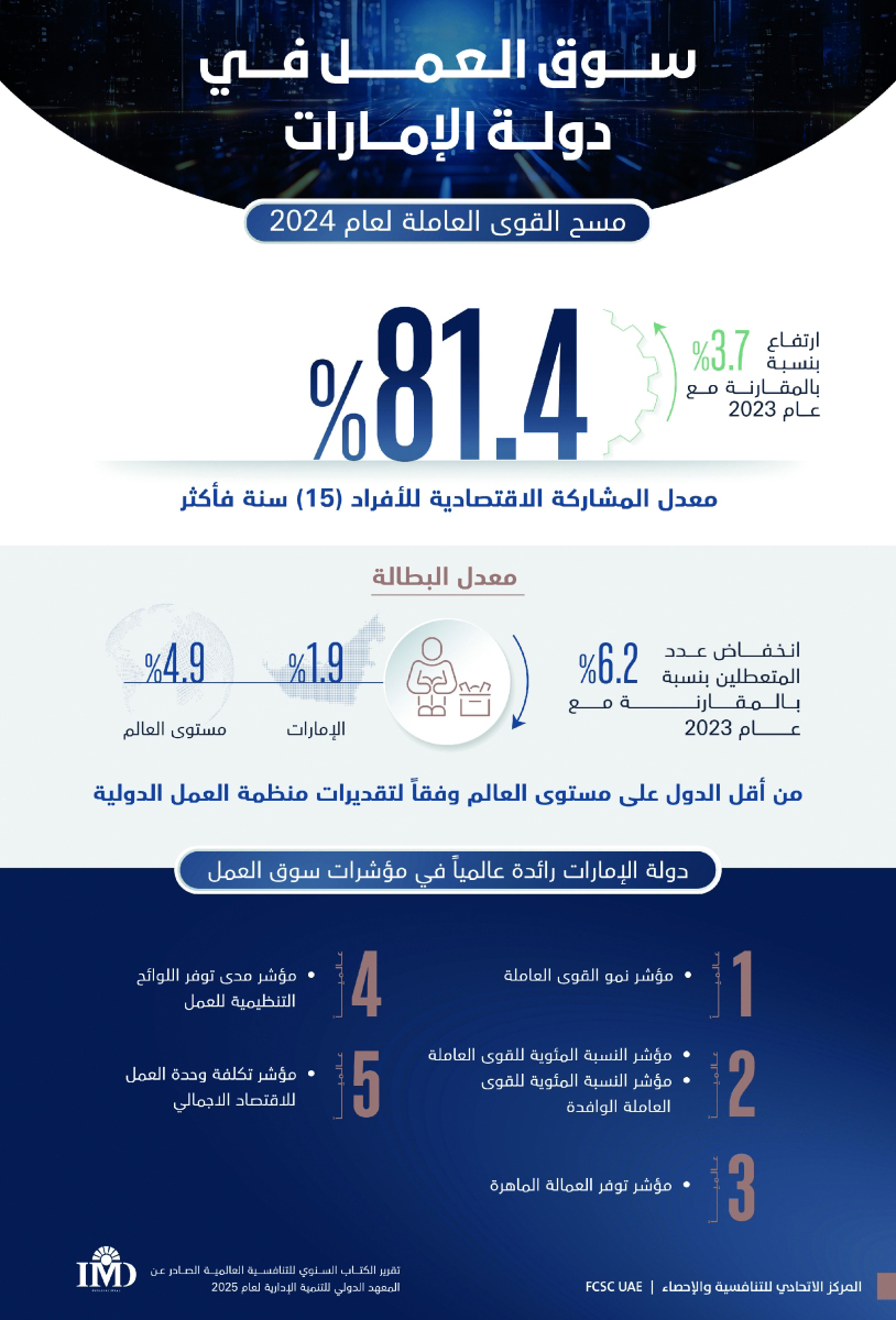 وكشف المركز الاتحادي للتنافسية والإحصاء عن مواصلة دولة الإمارات ترسيخ ريادتها العالمية في مؤشرات تنافسية سوق العمل، بتحقيق المرتبة الأولى عالمياً في مؤشر نمو القوى العاملة لعام 2025، في الكتاب السنوي للتنافسية العالمية الصادر عن المعهد الدولي للتنمية الإدارية.