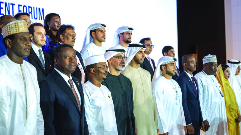خالد بن محمد ومحمد إدريس ديبي إتنو يتوسطان الحضور عقب الإعلان عن توقيع مذكرات التفاهم. وام
