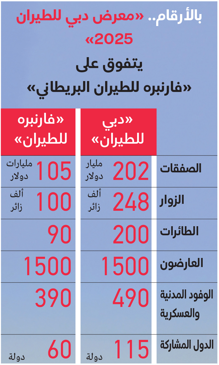 بفارق كبير.. معرض دبي للطيران يتفوق على «فارنبره البريطاني»