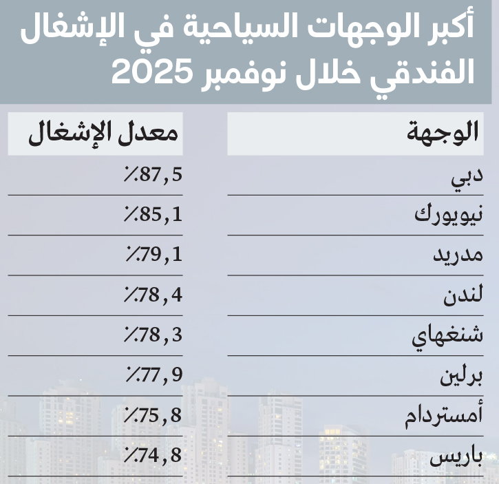 تصدرت دبي قائمة أكبر وأبرز الوجهات السياحية في العالم من حيث مستويات الإشغال الفندقي خلال نوفمبر 2025، مسجلة أداءً قوياً مع وصول المعدل العام لإشغال المنشآت الفندقية في الإمارة إلى 87.5%، وفقاً لبيانات تقديرية صادرة عن شركة «أماديوس» المتخصصة في خدمات وحلول تكنولوجيا السياحة والسفر.