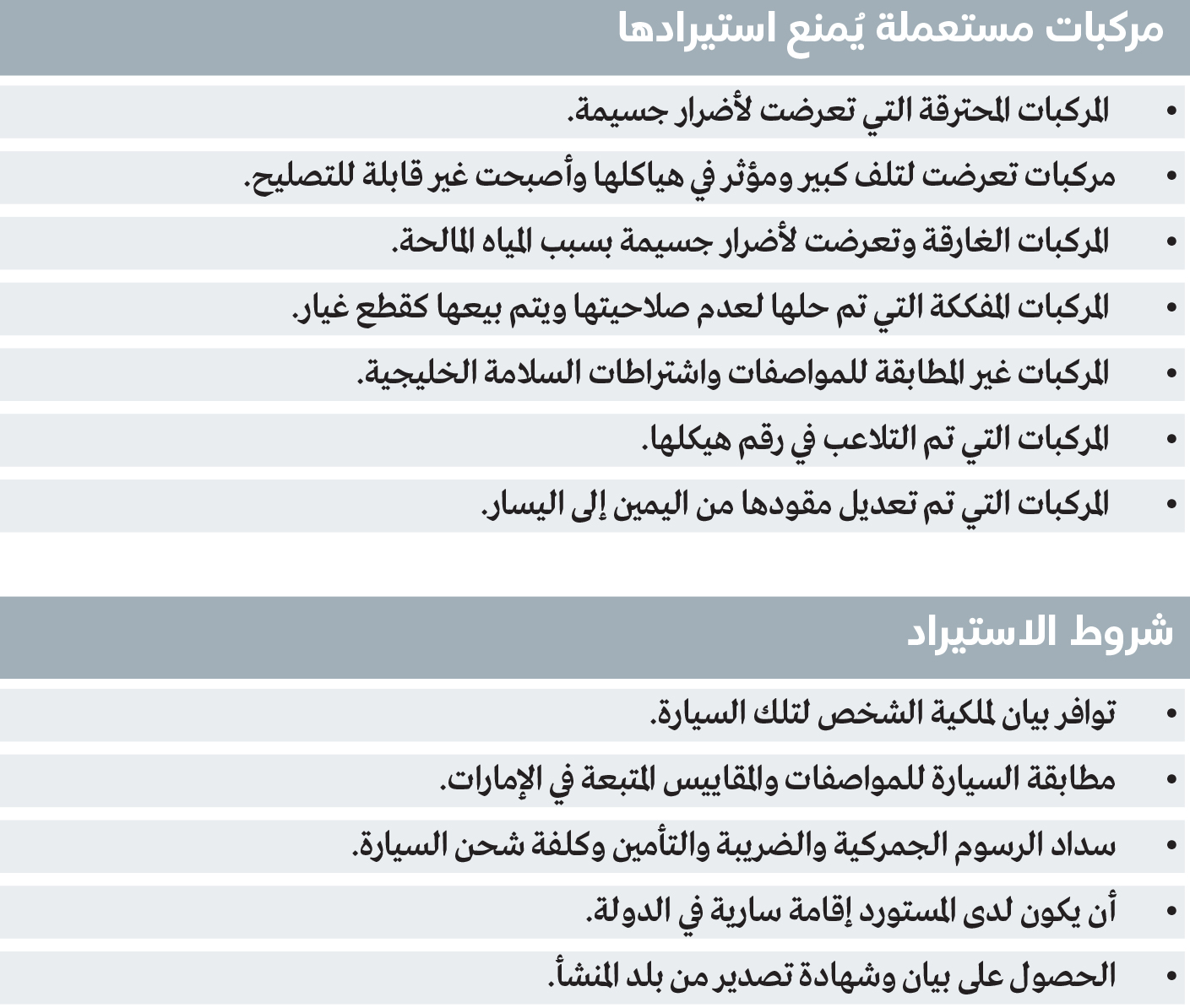 • استيراد سيارات مستعملة يتيح الحصول على سيارات حديثة بمواصفات مرتفعة وكلفة منخفضة، لكن شراء سيارات غير مطابقة يزيد من مخاطر الاستيراد.
