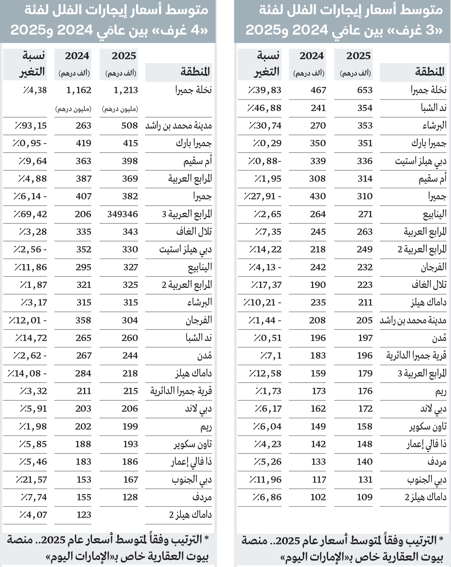 وكشفت البيانات أن إيجارات الفلل المكونة من ثلاث غرف ارتفعت في 19 منطقة مقابل انخفاضها في خمس مناطق، فيما سجلت منطقة «ند الشبا» أعلى معدل نمو في متوسط قيمة الإيجار السنوي بنسبة 46.47% لتصل إلى 354 ألف درهم سنوياً في عام 2025، مقارنة بـ241 ألف درهم في العام السابق، تليها منطقة «نخلة جميرا» بزيادة تصل إلى 39.83%.
