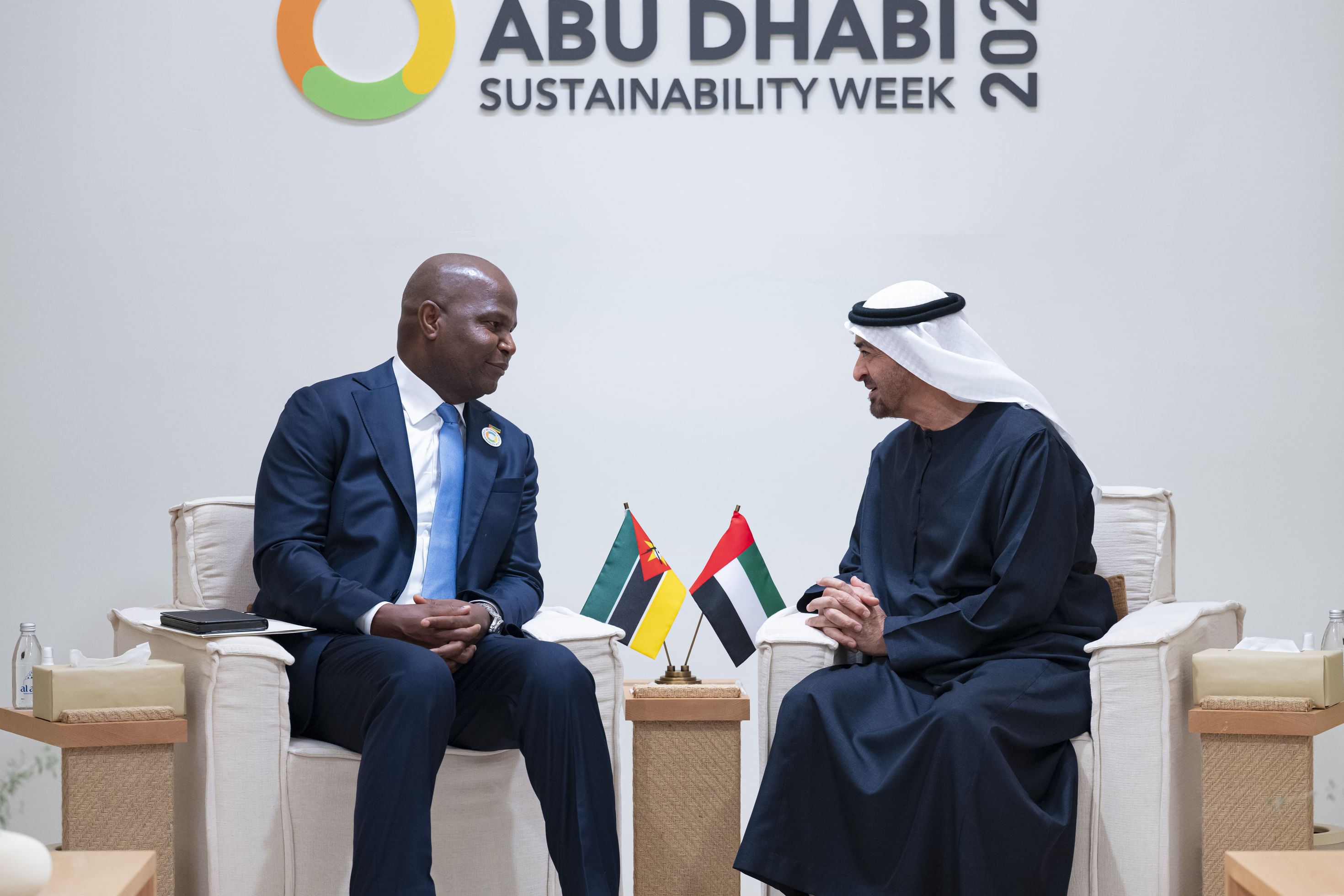 التقى صاحب السمو الشيخ محمد بن زايد آل نهيان رئيس الدولة "حفظه الله"، اليوم، رئيس جمهورية موزمبيق دانييل شابو الذي يقوم بزيارة عمل إلى الدولة يشارك خلالها في فعاليات "أسبوع أبوظبي للاستدامة 2026 " الذي يعقد في مركز أبوظبي الوطني للمعارض "أدنيك".