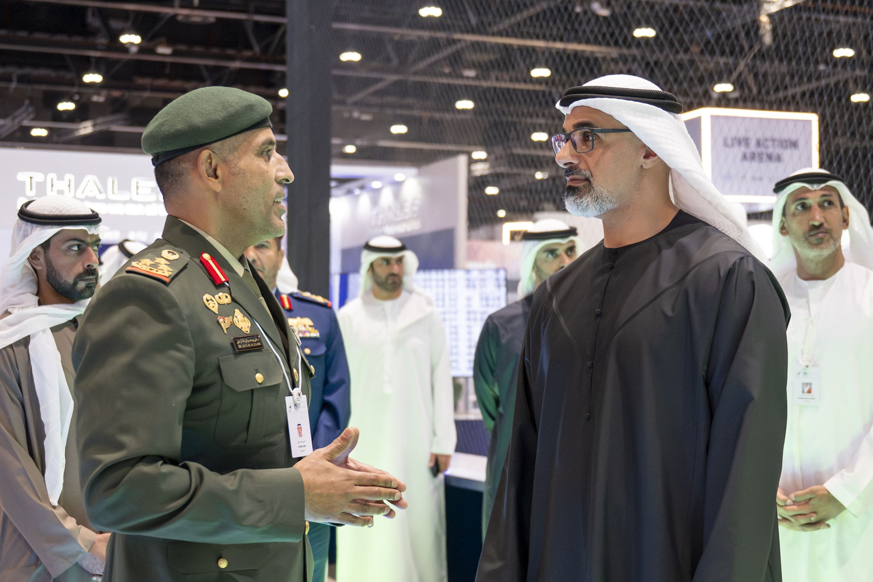 رافق سموّه، خلال الزيارة، سمو الشيخ زايد بن محمد بن زايد آل نهيان، والشيخ خليفة بن طحنون بن محمد آل نهيان، رئيس ديوان ولي عهد أبوظبي؛ ووزير الصناعة والتكنولوجيا المتقدمة الدكتور سلطان بن أحمد الجابر، ووزير الدولة لشؤون الدفاع محمد بن مبارك فاضل المزروعي، ومستشار الشؤون الأمنية في ديوان ولي عهد أبوظبي غانم سلطان أحمد السويدي، والعضو المنتدب والرئيس التنفيذي لمجموعة "أدنيك" حميد مطر الظاهري، ورئيس اللجنة المنظمة لمعرضَي "يومكس" و"سيمتكس" 2026 العميد الركن محمد عبيد المرشودي.