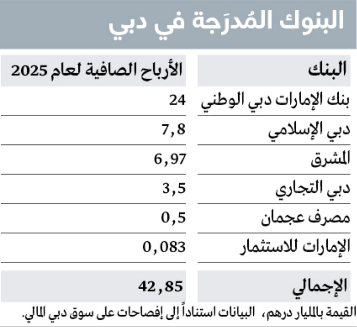 وحققت ستة بنوك مدرجة في سوق دبي المالي أرباحاً صافية، خلال العام الماضي، بقيمة 42.85 مليار درهم، وتصدر «بنك الإمارات دبي الوطني» القائمة بأرباح صافية قدرها 24 مليار درهم، وحلّ «بنك دبي الإسلامي» ثانياً بأرباح صافية بلغت 7.8 مليارات درهم، تلاه «بنك المشرق» بأرباح صافية بلغت 6.97 مليارات درهم، بينما جاء «بنك دبي التجاري» رابعاً بأرباح صافية بلغت 3.5 مليارات درهم.