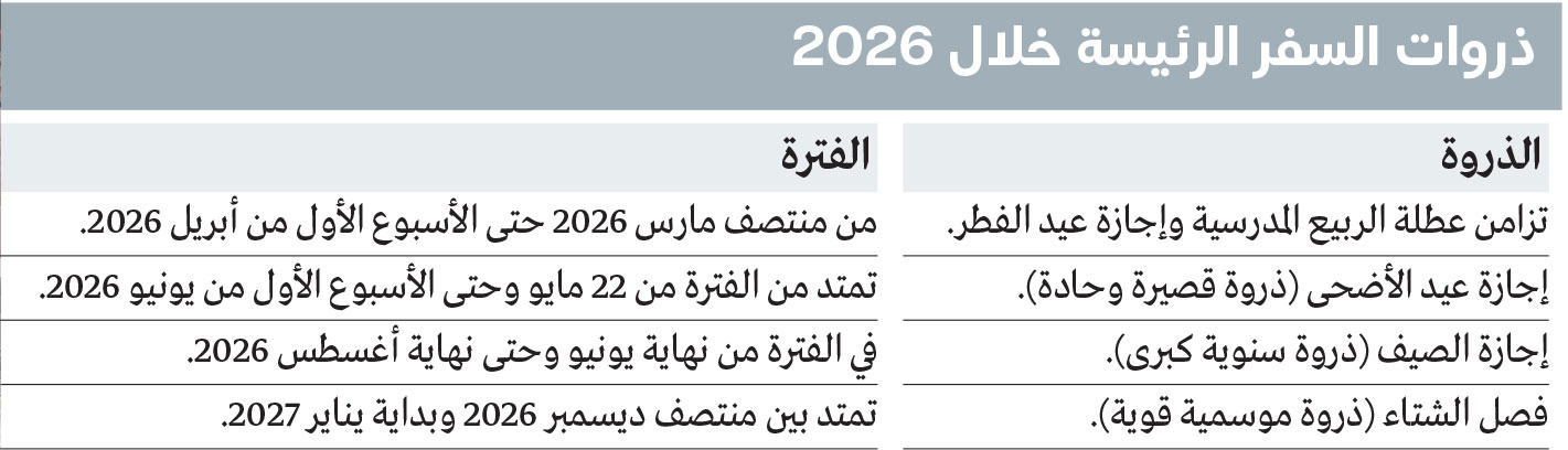 وتشمل الذروات الرئيسة، وفقاً لمعدلات الطلب الأولية، تزامن عطلة الربيع المدرسية مع إجازة عيد الفطر (وتمتد في الفترة من منتصف مارس المقبل وحتى الأسبوع الأول من أبريل 2026)، إضافة إلى إجازة عيد الأضحى، وهي ذروة قصيرة لكنها «حادة» من حيث ارتفاع الأسعار، وتمتد في الفترة من 22 مايو وحتى الأسبوع الأول من يونيو 2026، خصوصاً إلى الوجهات العربية الأكثر طلباً.