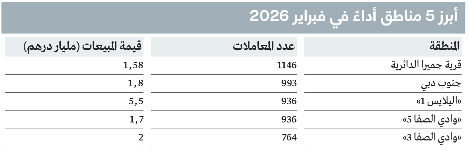 أما أغلى فيلا بيعت في فبراير 2026، فكانت عقاراً فاخراً في «لامير»، حيث بلغ سعرها 350 مليون درهم، بينما بيعت أغلى شقة مقابل 226 مليون درهم في «ذا ألبا ريزيدنسز» في جزيرة «نخلة جميرا».