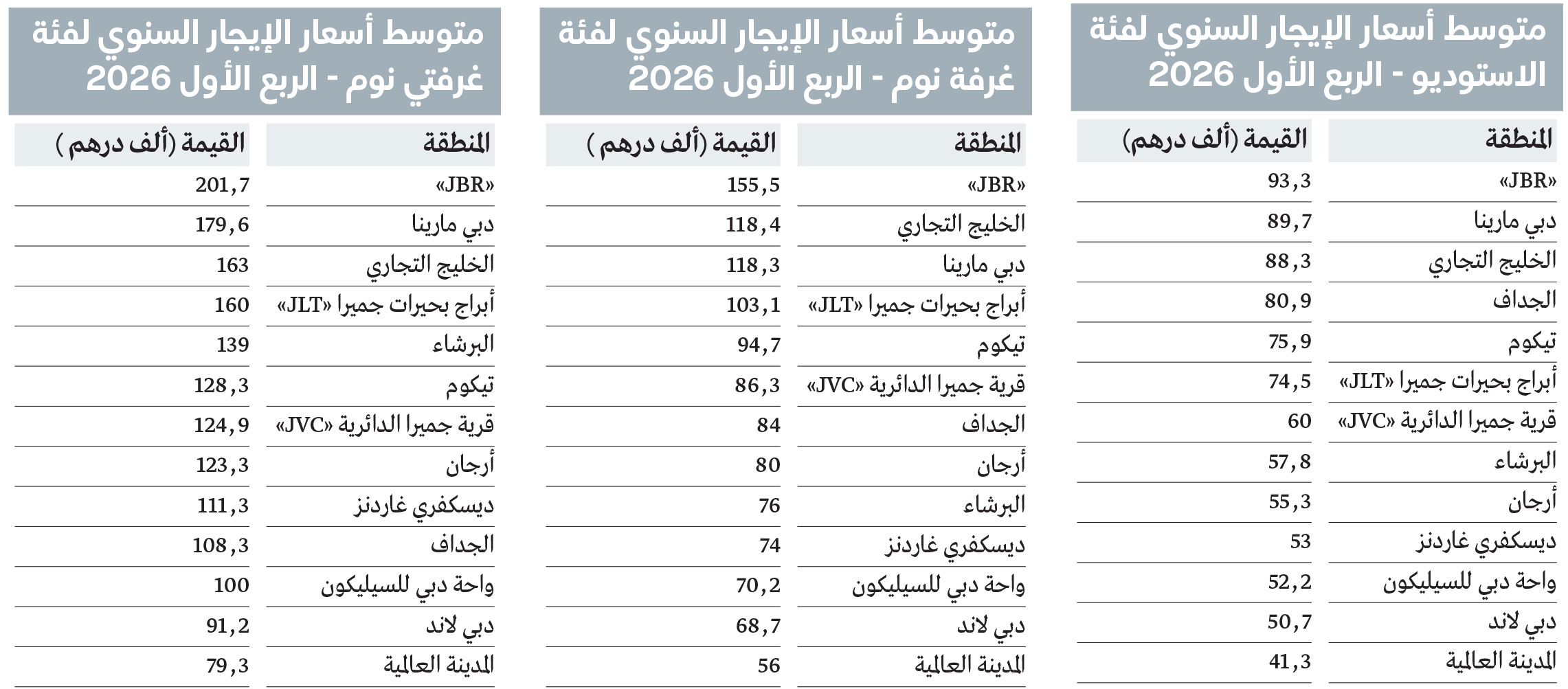 وبشكل عام، أشارت البيانات إلى أن متوسط أسعار الإيجارات السنوي لفئة «الاستوديو» في المناطق الـ13، خلال الربع الأول من العام الجاري، بلغ 67.14 ألف درهم، فيما بلغ متوسط أسعار الإيجارات السنوي لفئة «الغرفة الواحدة» نحو 91.16 ألف درهم، وبلغ المتوسط السنوي لإيجار «غرفتي نوم» نحو 131.53 ألف درهم.