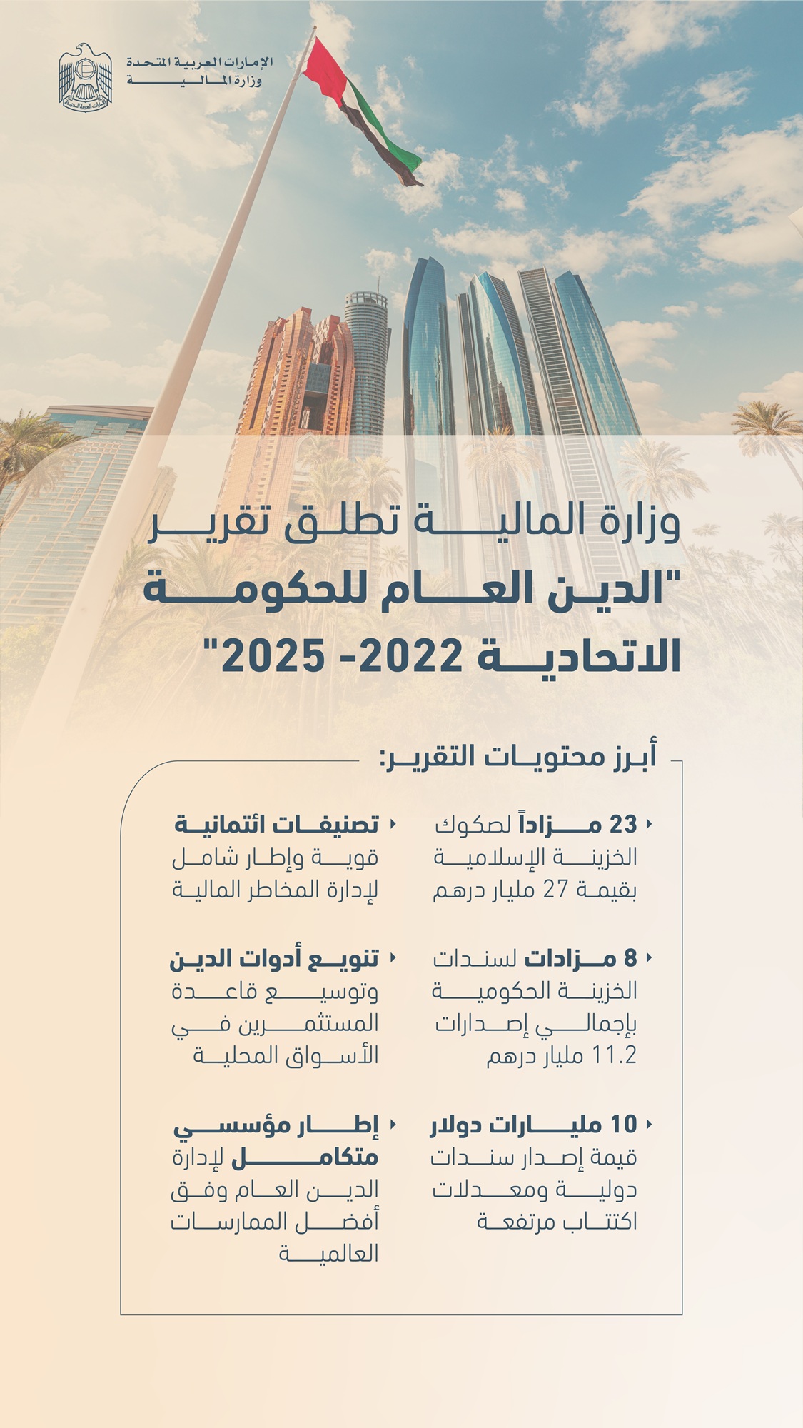 أطلقت وزارة المالية تقرير «الدين العام للحكومة الاتحادية 2022-2025» تحت عنوان «الدين العام.. كفاءة وتمويل مستدام»، والذي يمثل وثيقة استراتيجية ومرجعاً وطنياً يسلط الضوء على السياسات المتقدمة التي تتبناها دولة الإمارات في إدارة الدين العام حتى 31 ديسمبر 2025.
