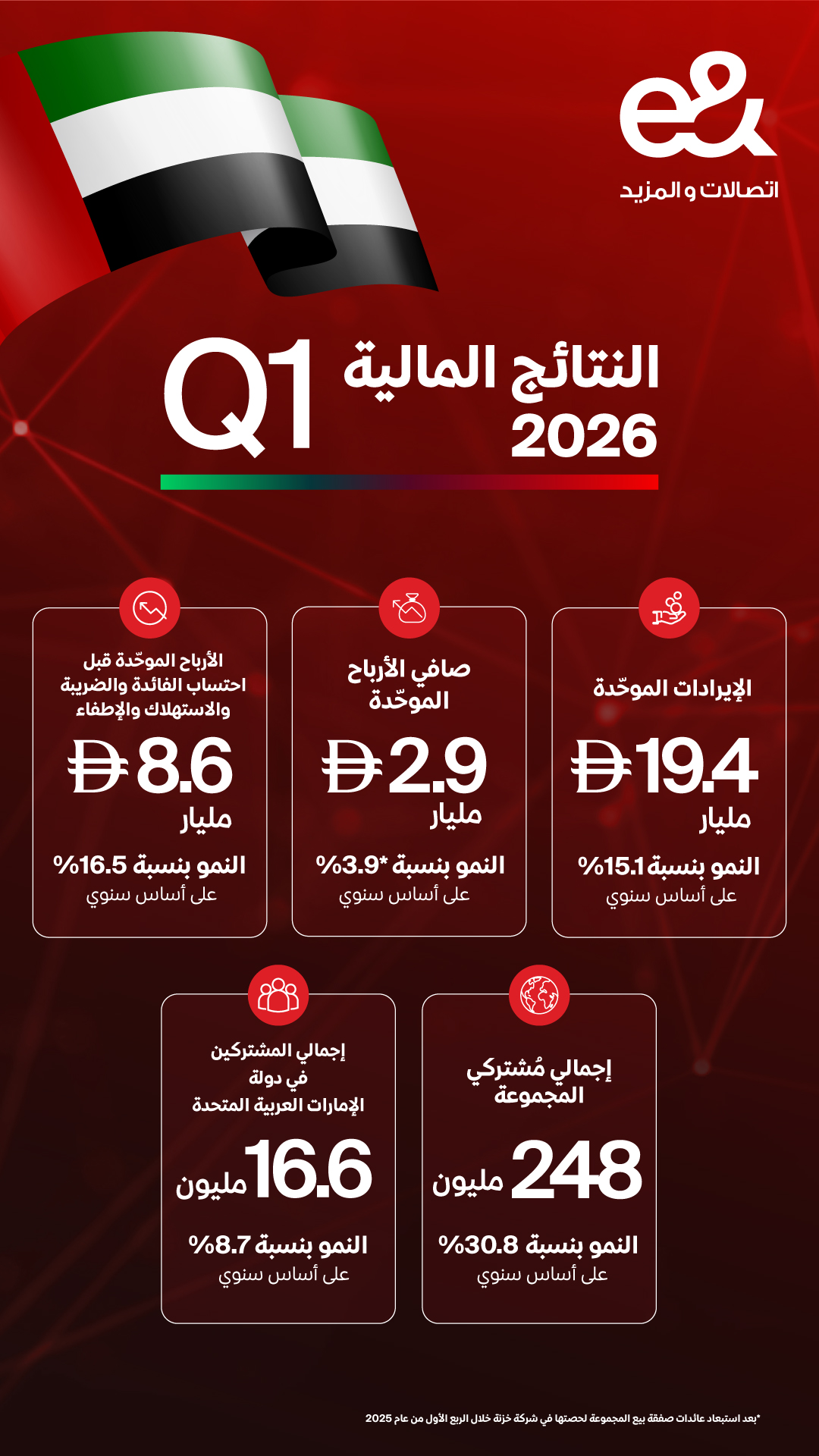 وتابع مسعود: «إن النتائج المالية القوية التي حقَّقتها (إي آند) في الربع الأول من عام 2026 هي انعكاس لمرونة ونجاح نموذج أعمال الشركة مع الالتزام الكامل بخَلْقِ قيمة مضافة ومستدامة للمساهمين. إذ واصلت (إي آند) مسيرةَ نموِّها خلال الرُّبع الأول من عام 2026، بتحقيق إيرادات موحدة بلغت 19.4 مليار درهم، بنسبة نموٍّ 15.1% مقارنةً بالربع الأول من العام الماضي، كما بلغت الأرباح قبل احتساب الفائدة والضريبة والاستهلاك والإطفاء 8.6 مليار درهم، بنسبة نموٍّ سنوية 16.5%، مما يعكس مكانة (إي آند) بوصفها محركًا أساسيًّا للاقتصاد الرقمي في المنطقة، ومحفِّز رئيسي للحلول الذكية التي ترسم ملامح المستقبل».