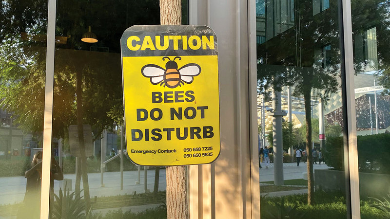 وضعت لافتات كتب عليها: «نحل.. الرجاء عدم الإزعاج» في العديد من الممرات بين أرجاء أجنحة إكسبو 2020 دبي، لاسيما التي تحتوي على الأشجار والزرع والنباتات.