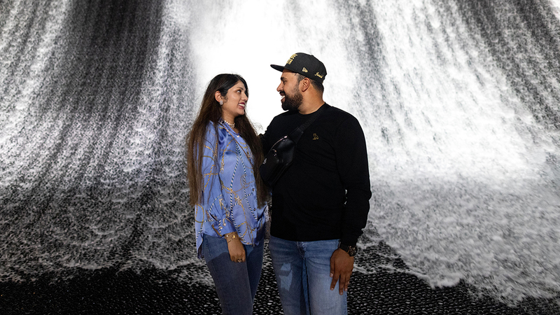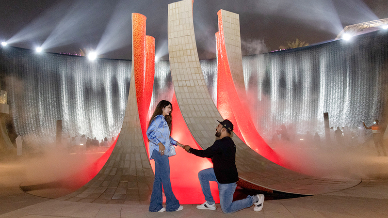وجد شاب في الأجواء الخاصة وجماليات الشلالات، الواقعة بين ساحة الوصل وحديقة اليوبيل في «إكسبو 2020 دبي»، مناسبة ليطلب يد الفتاة التي اختارها قلبه، لتكون هذه، ربما، أول خطوبة تحتضنها هذه البقعة الجميلة من الحدث الاستثنائي.