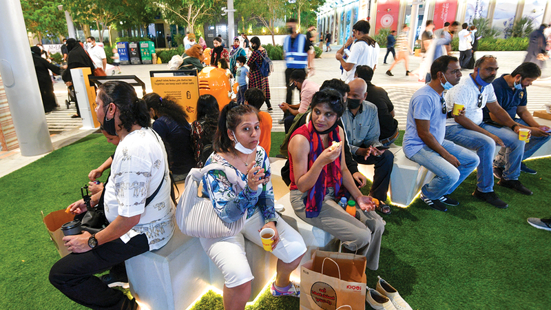 حوار خلال استراحة مؤقتة، تتزود فيها ضيفتا «إكسبو 2020 دبي» بما تيسّر من طعام ومشروبات دافئة وباردة، لاستكمال الرحلة، والاستمتاع ببقية الأجنحة التي تحتاج إلى أكثر من زيارة إلى المعرض الدولي. ويبدو أن جولة إحدى الزائرتين كانت أطول، إذ اضطرت إلى خلع الحذاء، ومنح القدمين فرصة للتنفس على براح اللون الأخضر.