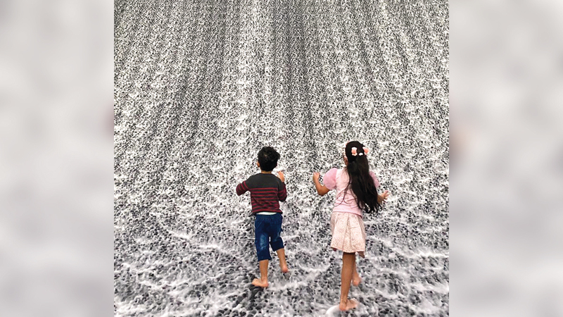 مازالت شلالات «إكسبو 2020 دبي» تثير دهشة زوار المعرض الدولي، كما الحال مع هذين الطفلين اللذين حرصا على اكتشاف طبيعة عملها والاستمتاع باللعب في مياهها، التي تتدفق بتصميم رائع عبر صفائح عملاقة، لتتساقط في اتجاه عمودي بارتفاع 13 متراً نحو دائرة نارية ساطعة الألوان في مشهد رائع يزداد جمالاً بتحديه الاستثنائي للجاذبية.