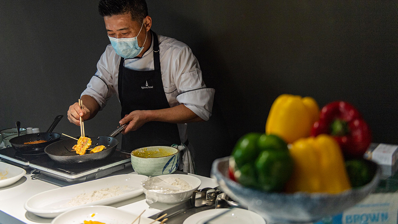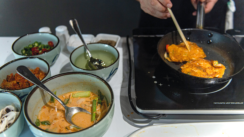 يسافر جناح كوريا الجنوبية في «إكسبو 2020 دبي» بعشاق الأكل الكوري إلى شوارع سيؤول المزدحمة والزاخرة بمختلف أنواع الوجبات التقليدية والحديثة، حيث نظم الجناح، أمس، معرضاً لأشهر المأكولات الكورية الطازجة في مطعم الجناح الذي اجتذب الزوار وعشاق الأكل الكوري، وذلك تحت إشراف الشيف الكوري جيمس كاونج، الذي قدم مجموعة من ألذ الأطباق ذات الطابع الشعبي، التي تلقى اهتماماً كبيراً من زوار الحدث الدولي من محبي الأكل الكوري، خصوصاً طبق «الكيمتشي بان كيك» الشهير والمعد باستخدام العديد من أنواع الخضراوات الطازجة، مثل البصل والفلفل الحار والكراث، وطبق أسياخ الروبيان، وغيرها من الأطباق التي يزخر بها المطبخ الكوري.