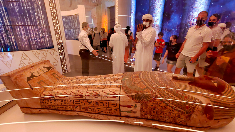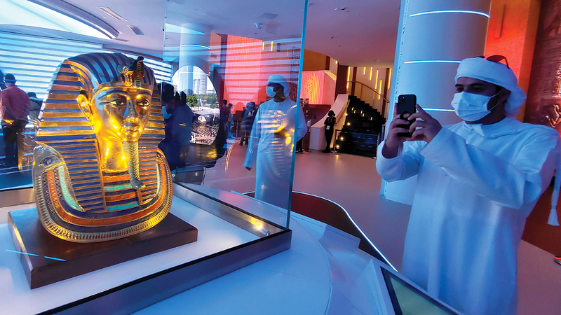 عيون تنظر بانبهار، وكاميرات جاهزة توثق لحظة اللقاء مع قناع الملك «الفرعون الذهبي» توت غنخ آمون، وتابوت الكاهن الطيب بسماتيك، ورموز اللغة الهيروغليفية القادمة من زمن بعيد جداً، في رحاب الجناح المصري في «إكسبو 2020 دبي»، الذي يصحب الزوار في رحلة متفرّدة حافلة بالكنوز والأسرار، التي مازالت تشغل العالم حتى اليوم.