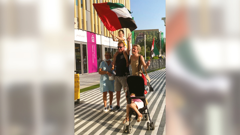 علم الإمارات الشامخ يرفرف عالياً، في مشهد يجسّد معاني الارتباط بهذه الأرض الطيبة «إمارات الخير»، التي يسع قلبها الجميع، وتحتضن بشراً من كل أركان الأرض.. فهنا آثرت هذه العائلة التي تزور «إكسبو 2020 دبي» أن تستبق الاحتفال بيوم العلم، وتعلن عن عشقها للإمارات ورايتها الغالية، وسط المعرض الدولي الذي يجمع العالم.