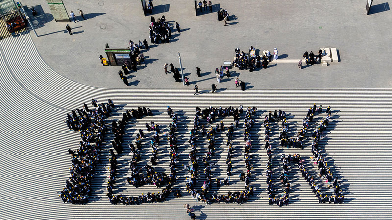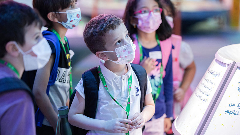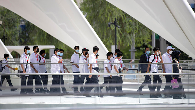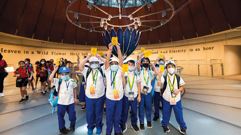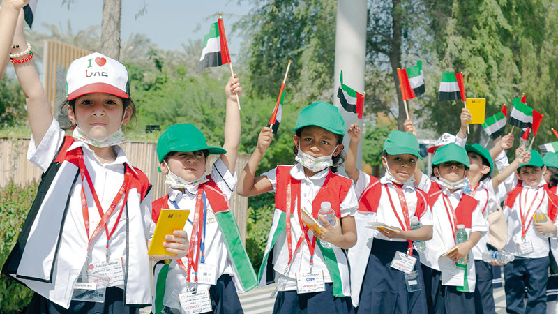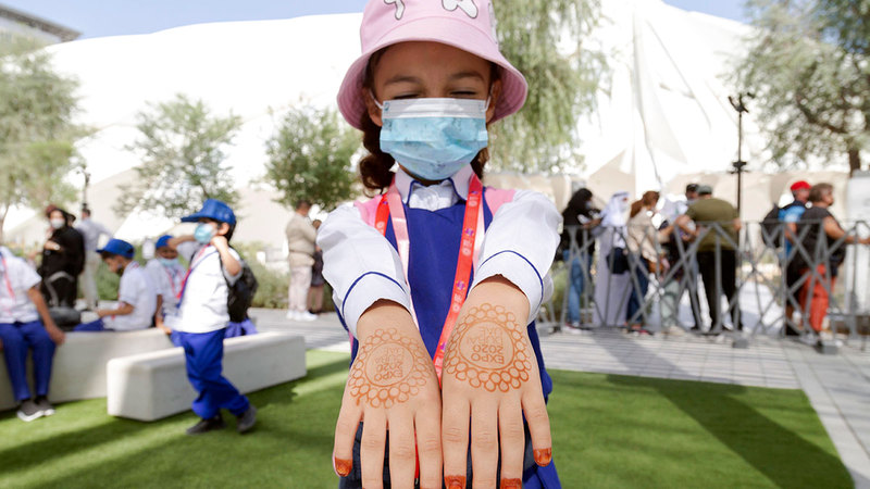 يد الصغيرة تزهو بالحناء، راسمة شعار «إكسبو» على أجمل كف، في مشهد فخر أمام جناح الإمارات، وكأن الطفلة التي أتت ضمن رحلة مدرسية تعلن اعتزازها بالمعرض الدولي، وتقول: «نحن جزء من حكاية الحدث العالمي». وكان 400 من طلبة المدارس الإماراتية قد اصطفوا، أول من أمس، لرسم الرقم 100 ألف باللغة الإنجليزية بمدخل منطقة الاستدامة في «إكسبو 2020 دبي»، احتفالاً بتحقيق 100 ألف زيارة مدرسية للحدث الدولي، منذ انطلاقته في أول أكتوبر الماضي.