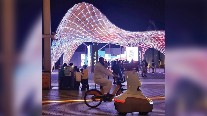 أمام الجناح العراقي في «إكسبو 2020 دبي»، تقاطعت رحلة الزائر الذي يستقل درّاجة هوائية مع أحد الروبوتات، التي تنتشر في المعرض الدولي، وتلفت نظر كثيرين.