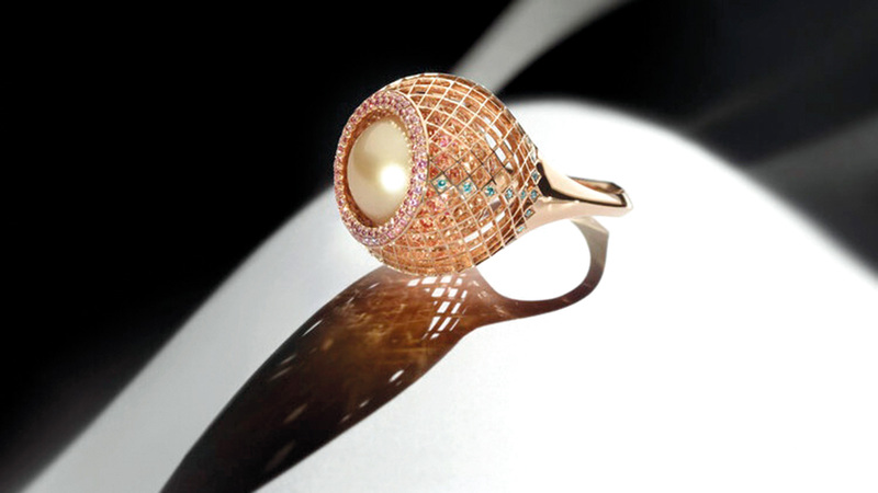 وصنع نيجل أوريلي، خاتمه المعروض في الجناح الإيرلندي، من لؤلؤة وردية، تتربّع في عمق كأسين من الذهب الوردي عيار 18 قيراطاً، حيث أضاء الكأس الخارجي بـ380 قطعة من الياقوت الزهري والبرتقالي، ليأتي الكأس الداخلي على هيئة شبكة تعامدت خيوطها بأحجار من الألماس باللونين الأخضر والزهري، ليبدو الخاتم وكأنه كوكب تدور في أفلاكه النجوم بألوانها وبريقها الساطع، لكن ذلك يحتاج إلى عدسة فوتوغرافية دقيقة لنقل منمنمات الخاتم بوضوح، لاسيما من خلف البيت الزجاجي الحاضن له في الجناح.