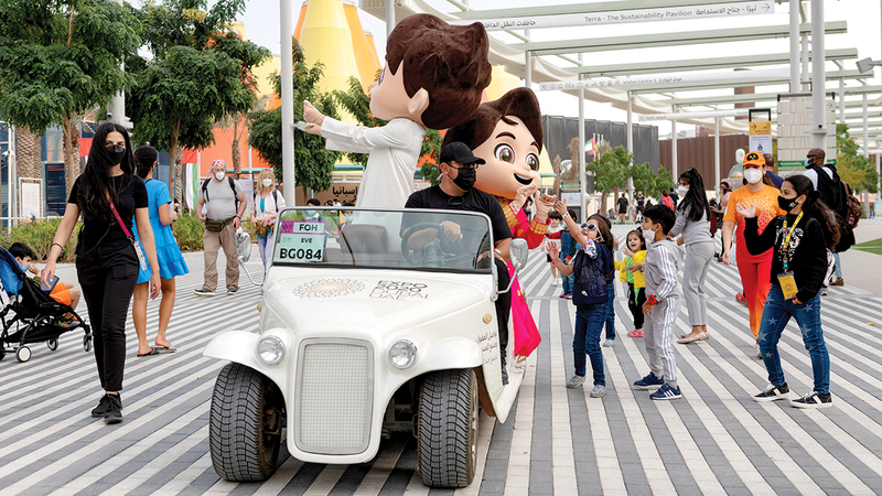 وفي عربتهما الجوالة، يطوف «راشد ولطيفة» ساحات المعرض الدولي في موكب فرح لا ينقطع، ويرسم الابتسامة الدائمة على وجوه ضيوف الحدث العالمي من كل الأعمار، وليس من الأطفال فحسب.