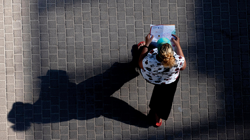من مسقط علوي، التقطت عدسة «إكسبو 2020 دبي» خطوات الزائرة التي تستعين بالخارطة للذهاب إلى وجهتها المقبلة، بينما يرافقها ظلها.