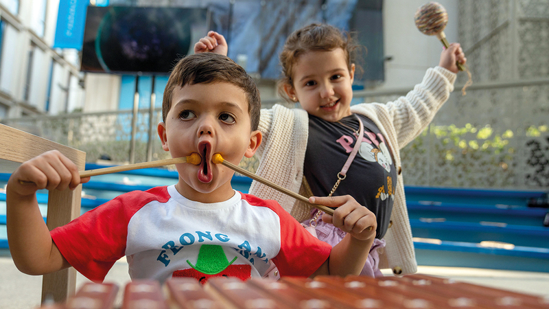 وهنا في الصورة يبدو المشاركان الصغيران في فرحة غامرة، إذ انهمكا في الفعاليات الترفيهية التي نظمها جناح السلفادور، ليرسم الطفل مشهداً مرحاً بأعواد العزف، وتستعرض الواعدة الأخرى قدراتها الفنية.