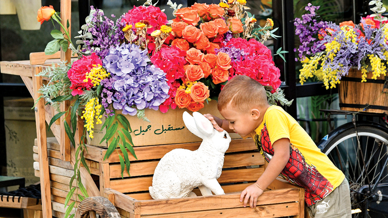 ويبدو الطفل هنا في حوار بريء مع مجسم «الأرنب» الذي يوشك أن يقبله، بعدما وجده في إحدى الساحات بالمعرض الدولي، وفي الخلفية يبرز شعار: «محبة.. تصالح.. مستقبل جميل» بين حديقة من الزهور الملونة، والتي رسمت مشهداً سعيداً، رصدته عدسة «الإمارات اليوم».