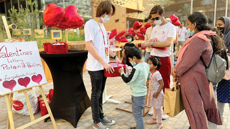 اصطف زوّار لـ«إكسبو دبي»، أطفالاً وشباباً وكباراً، للانضمام إلى فعالية «يانصيب»، التي نظمها الجناح البولندي الواقع في منطقة التنقل بمناسبة يوم الحب.