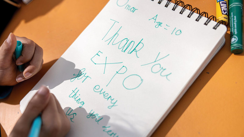 بعبارات الحب، وتشكيلات القلوب، تلونت رسائل الشكر التي خطتها أقلام لا تكذب ولا تتجمل، إلى «إكسبو 2020 دبي»، معربين عن إعجابهم بالحدث العالمي الذي وضع في قلب اهتماماته، متيحاً لهم فرصة المرح، والاستفادة من عوالم سحرية في كل حنبات المعرض الدولي الذي يعول على أجيال المستقبل، من أجل بناء غد مشرق للجميع.