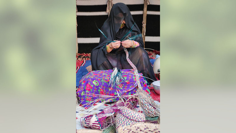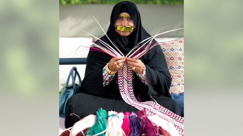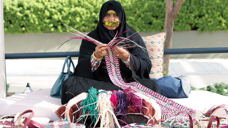 • «أم محمد» وغيرها من سفيرات التراث الإماراتي، يصنعن أنواعاً عدة من المشغولات اليدوية التراثية، مثل: «التلي، والحنة، والدعون، والسعفة».
