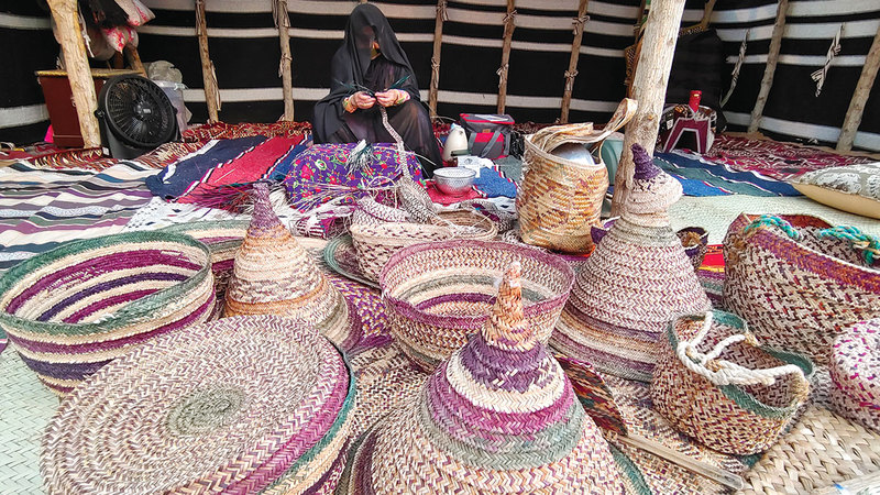 وتقول الوالدة (أم محمد): «أنا من سكان إمارة رأس الخيمة، وتحديداً من منطقة الظيت، وأهوى صناعة المشغولات اليدوية منذ أن كنت في الـ10 من عمري، وقد ساعدتني والدتي على إتقان هذه الصناعة الحِرفية والتراثية، من خلال تدريبي جيداً على كيفية تجهيز الخوص وسعف النخيل واستخدامهما في صناعة المخرافة، والسلال، والحقائب بمختلف أنواعها للكبار والصغار، والمراوح اليدوية، والمشب، واليبّه، والمغطى بأنواعه الكبيرة والصغيرة، والصرود، وغيرها من المشغولات اليدوية التي كان الأسلاف يستخدمونها في حياتهم اليومية».