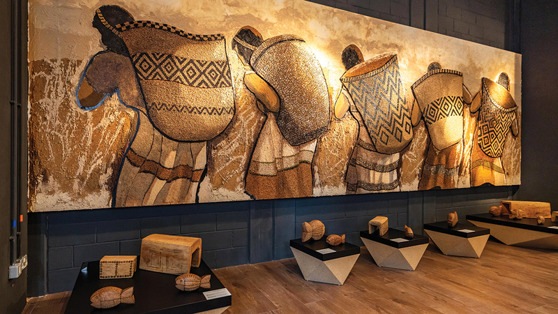 في بداية رحلة استكشاف الجناح، وتحديداً في مدخل باحة الاستقبال الخاصة، يتصدر العمل الفني أحد جدران المكان، ليدهش الناظر بتفاصيله الدقيقة المعتمدة على البذور والرمال من جهة، وتقنياته المعقدة من جهة أخرى، والتي شارك في استكمال تنفيذها في دبي فريق من المختصين، بقيادة المهندس والرسام الباراغواني كوكي رويز، الذي كرس مسيرته الفنية بالكامل، لإنشاء أعمال غير مألوفة، اتكأت على مكونات فريدة، وعلى ما يلتقطه الفنان من حوله، من كنوز الطبيعة الغنية، وثرواتها اللامحدودة، مستبدلاً من وقت إلى آخر الفُرش والألوان بأصابع اليدين والملاعق.
