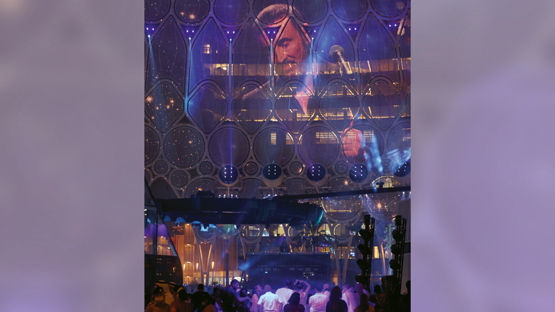 ورافقت الغناء عروض فنية مبهرة، إذ تمايلت الألوان والأضواء على مسرح الوصل، أيقونة «إكسبو 2020 دبي»، كأنها تتراقص على إيقاع الموسيقى، قبل أن تنهمر على القبة كالشلالات، ما زاد من ألق الأمسية ومن عناصر الإبهار فيها.